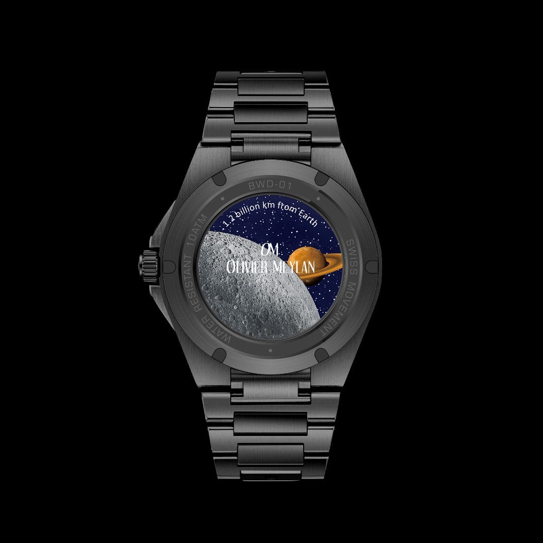 At the heart of the Black Out Edition is a striking high-grade Super-LumiNova C3 luminescent moon dial and index markers, delivering vivid legibility. The dial itself is a work of art: a handcrafted copper surface, oil-pressed to replicate the rugged, cratered landscape of Titan, Saturn’s largest moon and one of the most enigmatic bodies in our solar system. The result is a dial rich in texture, depth, and celestial character.