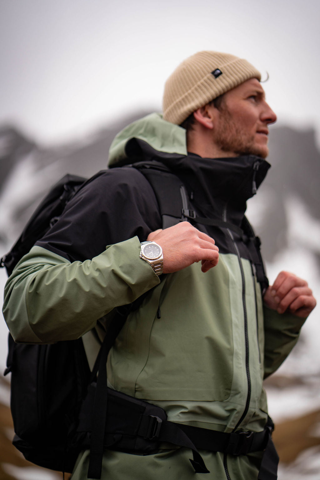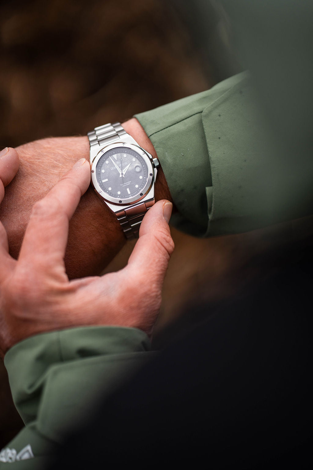Powered by a Swiss Sellita SW200 automatic movement, the watch guarantees reliable precision and craftsmanship, with an alternative quartz version featuring a Swiss Ronda movement for those seeking ultimate accuracy. Practical yet elegant, it includes a crater date window positioned for optimal readability and robust crown guards for added protection.